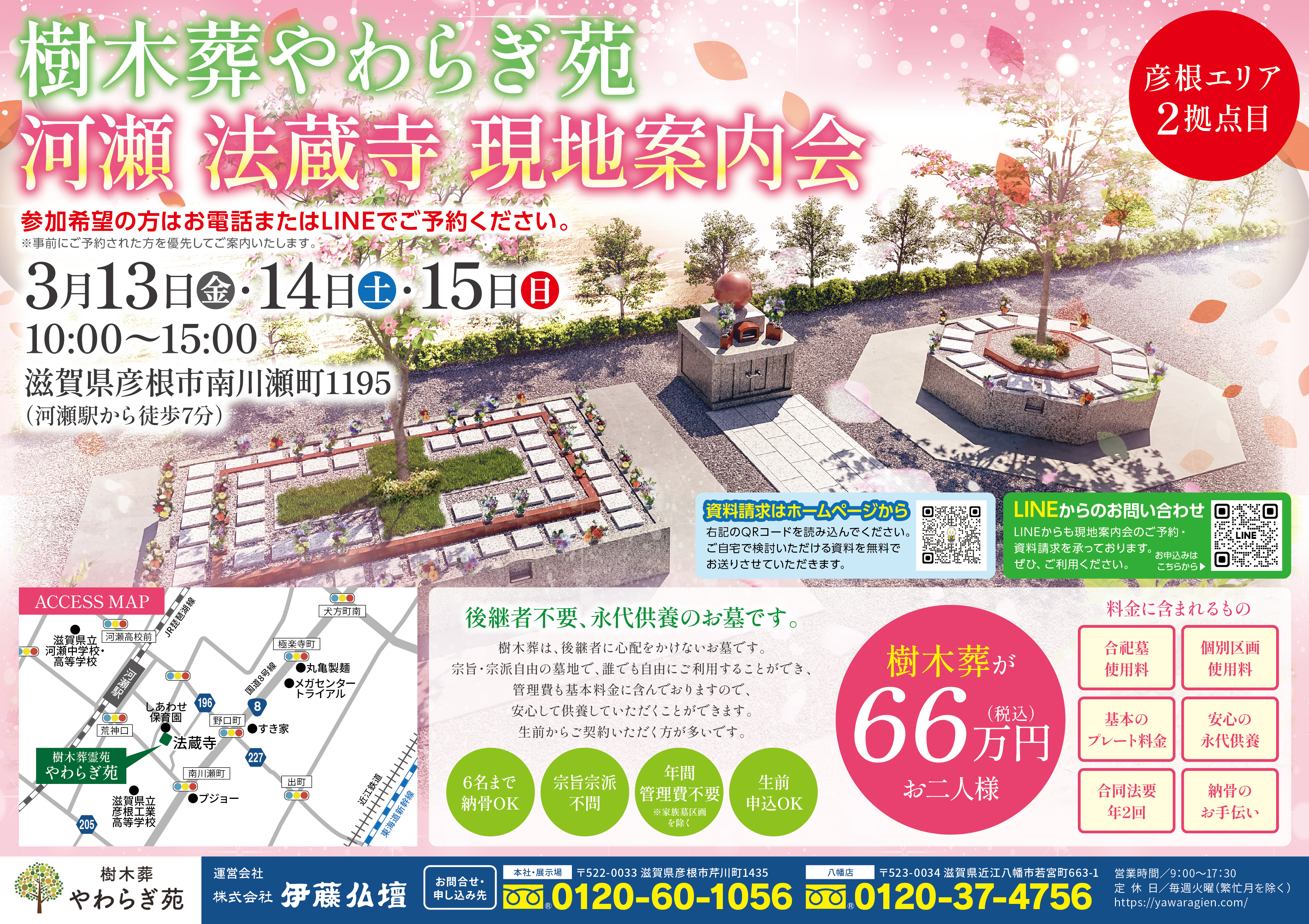 また、新拠点開苑を記念して3月13日から15日までの3日間はスタッフが法蔵寺霊苑にて直接お客様をお待ちしております。実際に現地の雰囲気を見てみながら樹木葬についてスタッフにご質問いただける絶好のタイミングとなっております。